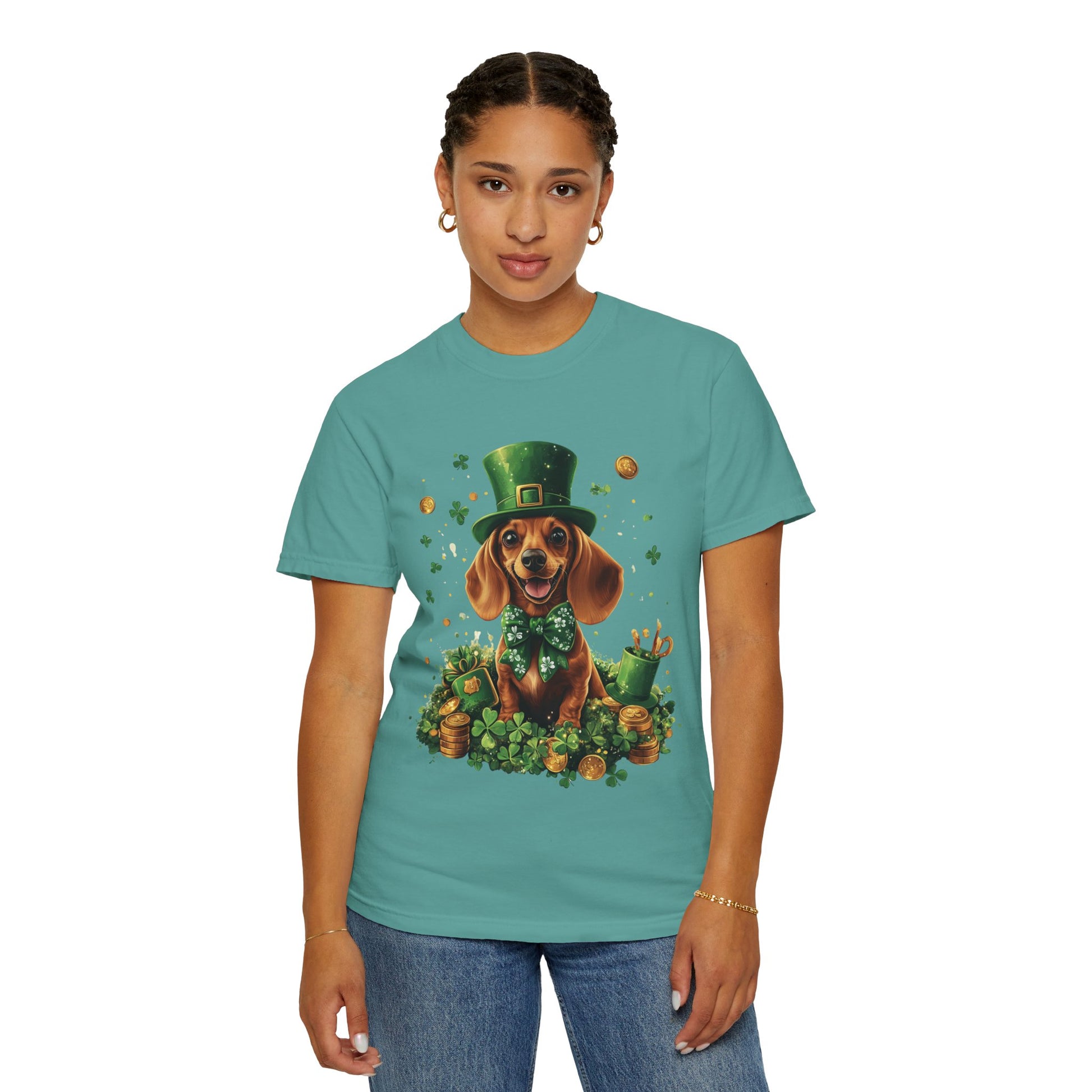 St. Patrick’s Dachshund T-Shirt — Lucky Pup with Shamrocks & Gold